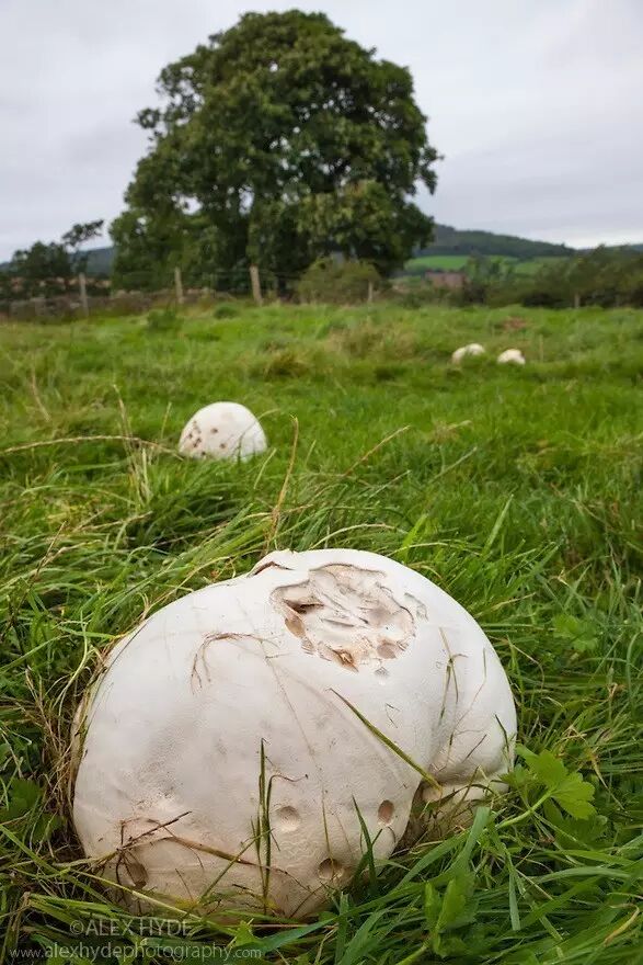 如果有机会摘一朵仔细观察(前提是该马勃还未成年,确保不会被喷),会发现马勃和一般蘑菇不大像,完全没有伞盖,也没有明细的菌柄(少数种类还是有的),只有一个密闭的近乎圆球状的子实体。像之前介绍的草菇<戳这里>,幼嫩时候是椭球一样的草菇蛋,看起来也像是马勃,不过切开来就有伞盖暴露了。