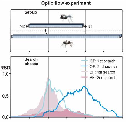 从觅食蚁上被拆除下来的工蚁,被放置在测试通道后在不同位置的相对搜寻强度(RSD)。OF:光流组(不蒙上复眼腹侧);BF:蒙眼组。图片:Pfeffer S E / Science