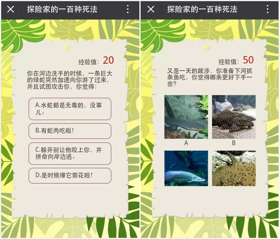 关卡设置。如果你没有合适的原创图片,直接用文字描述也是可以的,比如:A. 电鳗;B. 下口鲶;C.巨骨舌鱼;D.南美江魟。