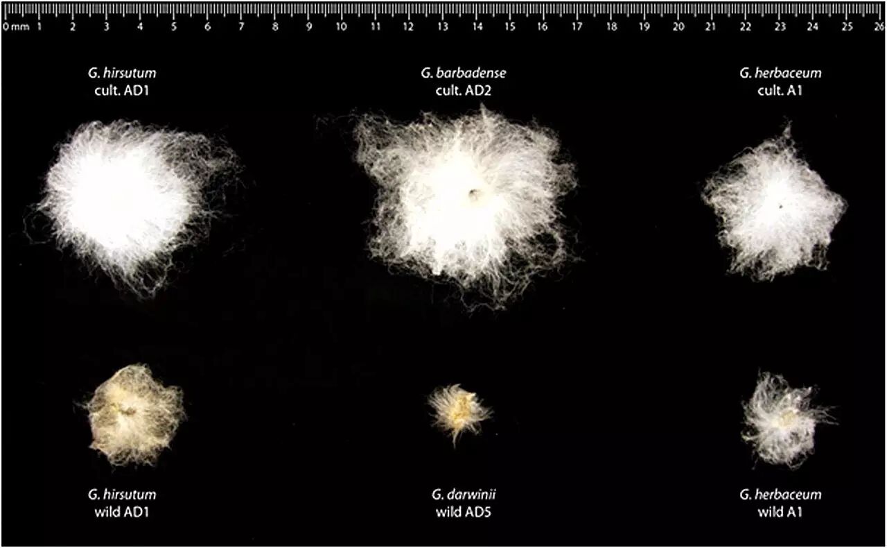 棉花种子,左起:陆地棉、海岛棉、草棉。上面一排是栽培型,下面一排是野生型。图片:pnas.org
