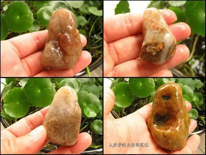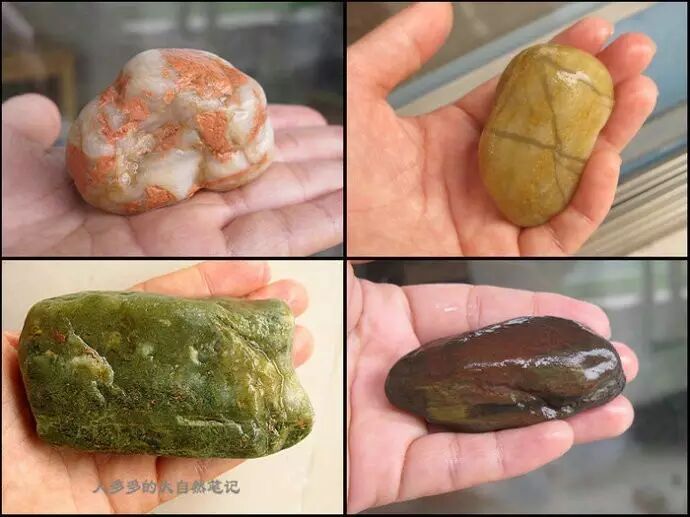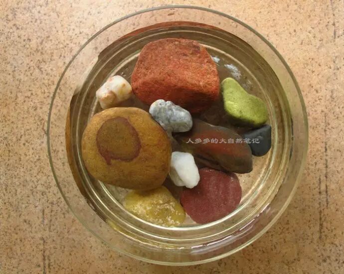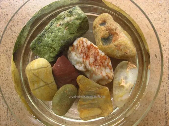 我捡回的石头出自龙头拐地表的溪水中,它们大多光洁但还不算圆滑,在水中色彩丰富鲜艳,石英质居多。 通常情况下,富含铁的呈暗红色。
