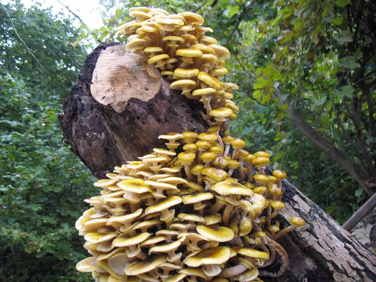 由于蜜环菌侵入性强,对树种并无强烈特异性,因此常造成成片树木产生根腐病而死亡。而树木尸骸上那些可爱的榛蘑,正是蜜环菌完成对树木屠杀后的炫耀方式。