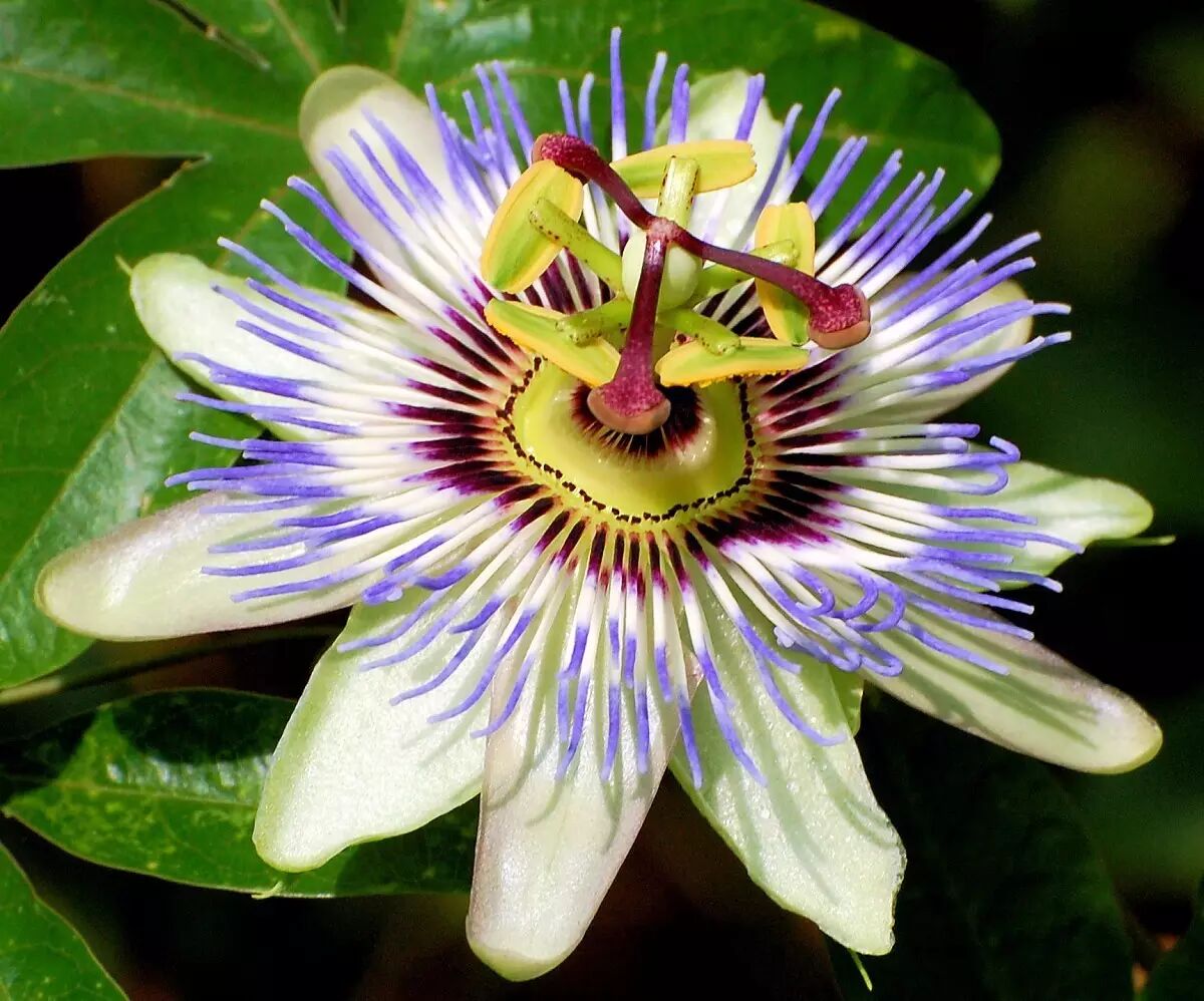 西番莲的副花冠 [就是那些须须,花蕊是最上层的那紫色的3(雌蕊)+黄色的5(雄蕊)] 颜色排列和鸡蛋果的不同,可以从这一点来分辨二者。图片:wikimedia commons