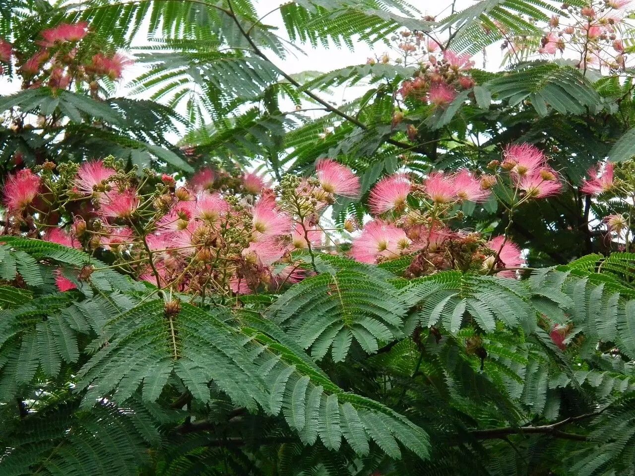 合欢虽是高大乔木,但和娇小的含羞草(Mimosa pudica)在植物学上同属豆科含羞草亚科;虽然不同属,某些形象特质倒是挺重合:羽状复叶,细密辐射的花冠,以及同样对温暖气候的偏爱,让它们看上去也就颇有些“姐妹相”。更有趣的是,比起触碰之后则低头收敛的含羞草,合欢虽然不至于如此敏感,但对光与热的变化感应也十分微妙,夜幕降临,细小叶片则次第收起,因此又有“夜合花”的别名。