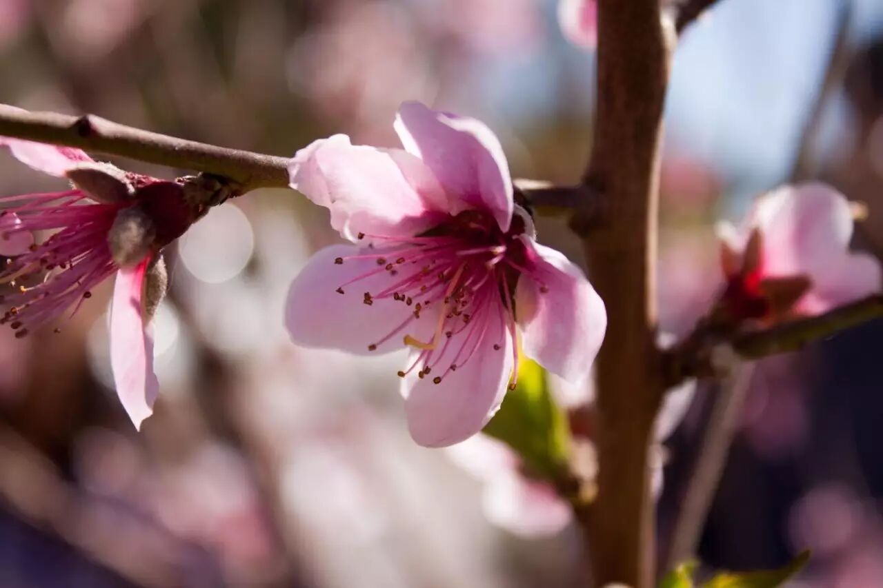 说到桃花,大抵大家都能第一时间会想起“桃花运”、“桃花劫”这样的说法。实际上,作为中原大地上历史最为悠久的栽培植物之一,桃花以其鲜润轻盈的花瓣早早地点亮了人们内心的儿女情怀,而丰美多汁的果实又被迅速地与女子的丰饶多产联系起来。《诗经•桃夭》里那位“桃之夭夭,灼灼其华”的美少女,后来不就是“桃叶蓁(zhēn)蓁,有蕡(fén)其实”么?盛开在阳春三月里,正是草长莺飞的恋爱好时光;一片水红花光氤氲浮动,更是如同情侣们心神往之的温柔乡。在古老而淳朴的社会里,这就是对于一段美好爱情的终极期待了。