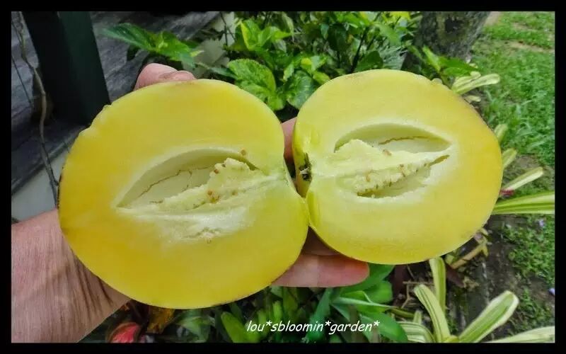 不过,什么“三千年一开花,三千年一结果”只能是神话了,香瓜茄小苗定植之后4-6个月就能开花结果,就是只争朝夕的果子。成熟的香瓜茄果子,中有空腔,并不像茄子俺么敦实,倒是更像甜瓜。香瓜茄名字大概是从此而来。