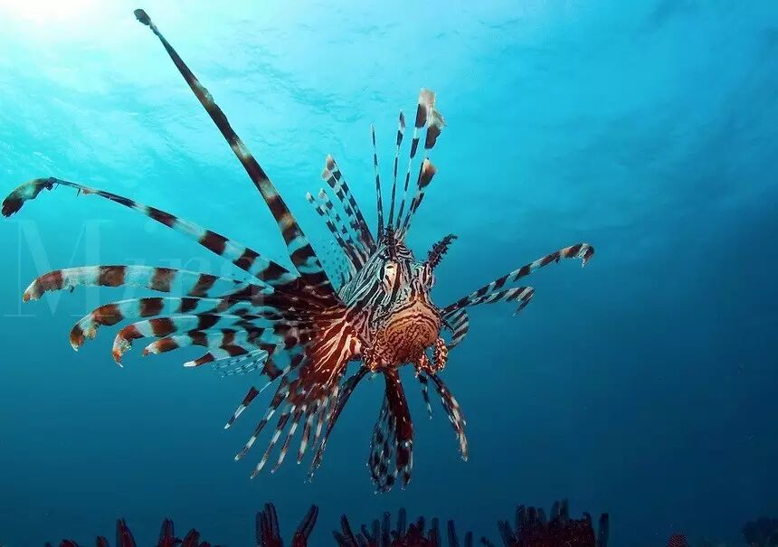 蓑鮋又叫狮子鱼,在动物世界里的出镜率很高,但是你看它长得那么张扬,肯定是有两把刷子的。它们漂亮的胸鳍、腹鳍和尾鳍里都隐藏着毒针,被惊扰之后会分泌让人感觉剧痛的毒液。这些毒液并不致命,但足以让还需要再游十几公里的你溺水而死……