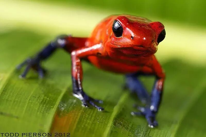 以上三种青蛙分别是草莓箭毒蛙、钴蓝箭毒蛙和黄金箭毒蛙,它们之所以敢于色彩如此艳丽,自然是有毒咯。箭毒蛙会收集有毒昆虫携带的毒素,储存起来,然后通过皮肤上特殊的腺体分泌。箭毒蛙的毒性如此强烈,以至于土著人会用它们提炼箭毒,抹在箭上增加弓箭的杀伤力。