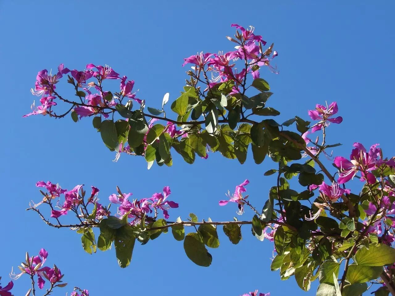 红花羊蹄甲 Bauhinia purpurea 花期一般在秋冬季,而宫粉羊蹄甲 B. variegata 和洋紫荆 B. × blakeana 则都是全年随时可能开花,绵延时间极长,最盛一般集中在冬末早春,届时一树紫霞盖绿云的场景将是十分壮观的。