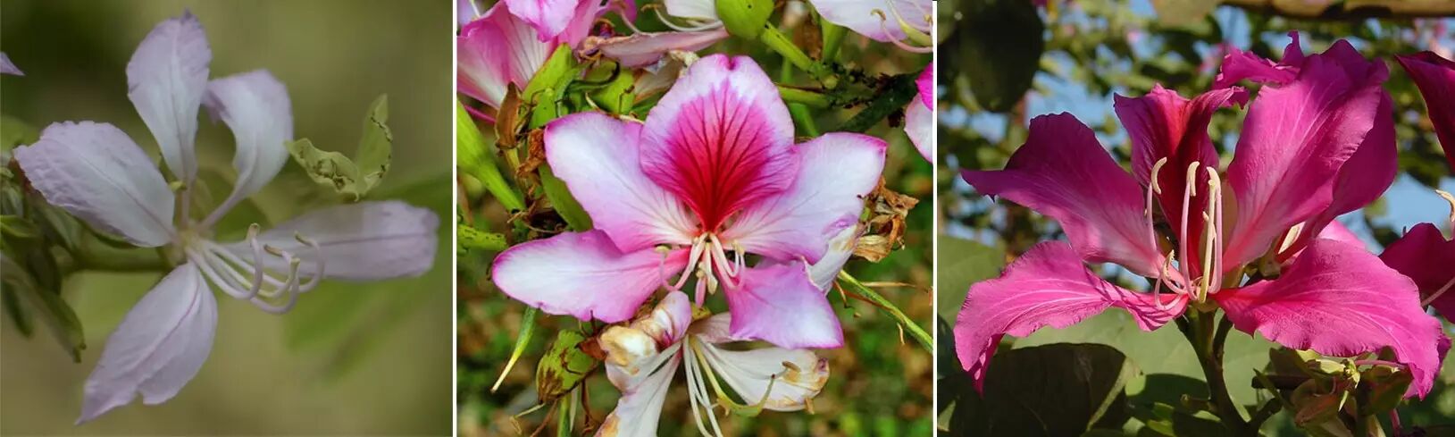 从左至右:一般花色淡、长瓣柄、三枚可育雄蕊的红花羊蹄甲B. purpurea ;近轴中央瓣片宽且有斑驳纹络的宫粉羊蹄甲 B. variegata(一般花色也较淡);近轴中央瓣片中部及以下深紫红色、有两枚雄蕊明显短的洋紫荆 B. × blakeana(一般花后不结果)。图片来源(从左至右):自摄、australianseed.com、wikipedia