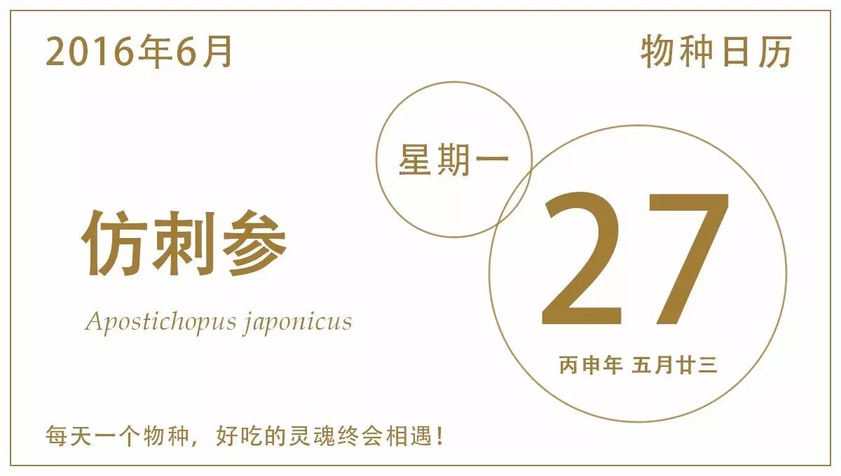 海参,海参纲的一类棘皮动物统称,身体呈圆柱形,两侧对称,体壁肉质,内含细小骨片,海参平时靠着腹面的管足在海底缓慢移动,若是一动不动趴在海底,就像一坨酸黄瓜,故名“海黄瓜”。全世界有1000多种海参,形态多样,颜色丰富,在各大海域都有它们的身影,有些海参的背面管足退化成圆锥状肉刺状的疣足,根据肉刺有无,从外观上大致可以把它们分为两大类,一类背面光滑,称为光参;背上有刺的则称为刺参,今天物种日历的主角就诞生其中。