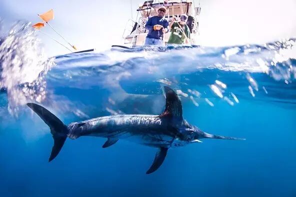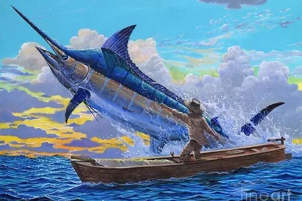 《老人与海》中老渔夫圣地亚哥捕获的马林鱼,根据其描绘的捕鱼情形和形态特征,很可能指的就是大西洋蓝枪鱼。大西洋蓝枪鱼体长可达6米,体重超800公斤,凭借着优雅的身姿和超强的游动能力以及给人类带来的征服快感,它成为了稀有而珍贵的垂钓鱼种。