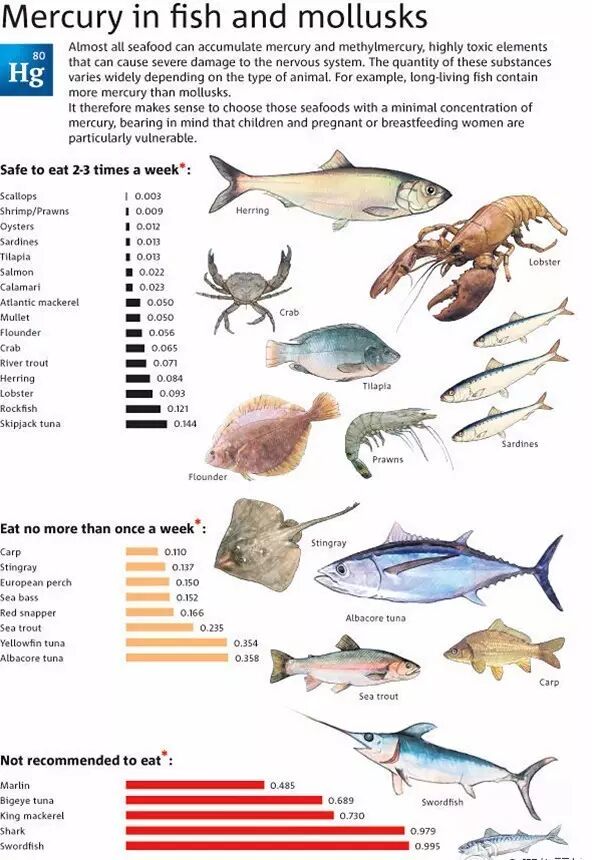 部分海产汞含量示意图。通常贝类(扇贝和生蚝等);甲壳类(诸如对虾、海螯虾和海蟹)以及一些鱼类(如三文鱼、鲱鱼、沙丁鱼、鳕鱼和比目鱼)体内甲基汞水平较低,一周可以食用多次;鲤鱼、海鳟、黄貂鱼、红鲷鱼和黄鳍金枪鱼等食用频率不宜超过一周一次;大型金枪鱼、旗鱼、鲨鱼和剑鱼体内甲基汞含量较高,应避免经常食用。图片:FDA