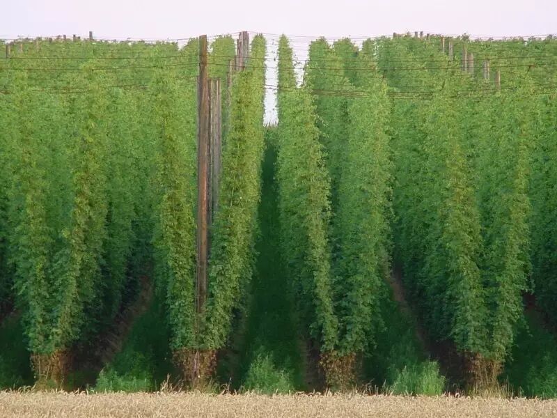 作为一个农学生,我此生近距离接触活着的啤酒花也就两次。一次是在德国巴伐利亚的乡间公路上,我注意到路旁有一排排平行的被斜架着的绿色枝条,比葡萄藤要高而且坡度大许多,我愣了一会儿才反应过来是啤酒花。另一次是在纽约州中部一个湖岸的葡萄酒庄里,在眺望湖边葡萄园景色时,那堂课的教授随手从边上的树上拉了一个枝条,上面就开着一朵朵的啤酒花。
