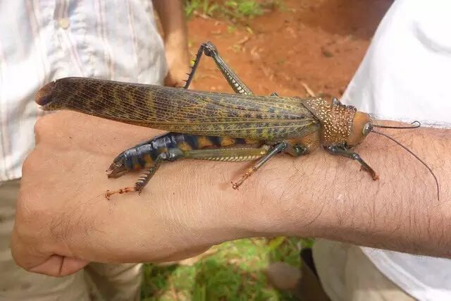 一只将近12厘米的Tropidacris cristata停在人手上,和一把普通的直尺差不多长。图片:reddit.com