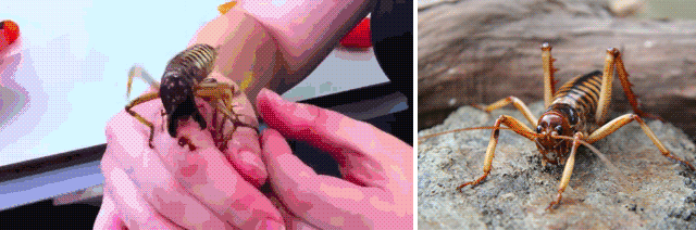 树沙螽咬起人来一点儿也不含糊。左图截自SavageTV的视频,右图来自Zealandia Eco-Sanctuary