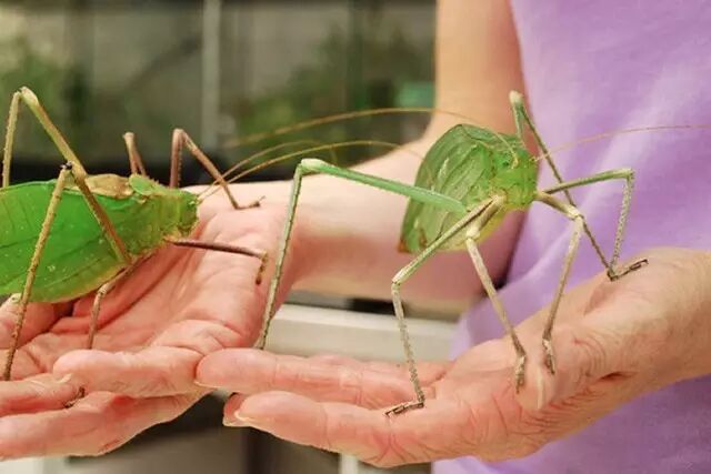 两只大叶螽停在人手上。图片:carnivoraforum.com