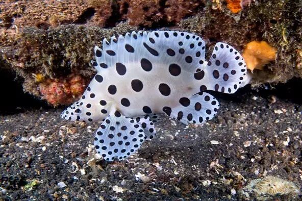 驼背鲈(Cromileptes altivelis)可能算是最名贵的石斑鱼种了,它就是传说中的“老鼠斑”。光念名字都仿佛听见了金钱的声响,老鼠斑十分容易辨认,全身白色或半透明色,布满黑色的小圆点,背部高高隆起,幼鱼的体色更加鲜亮。