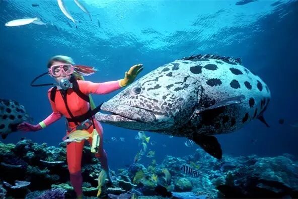 石斑鱼是凶猛的肉食性鱼类,它们喜欢等待猎物靠近后发起突然袭击,捕食时它们会张开大口,利用海水的负压产生吸力,瞬间整个吞噬而不是撕碎猎物,它们会利用咽喉里的牙板磨碎猎物。曾经有过巨型石斑鱼吞食潜水员的记录,最终因为无法压碎氧气瓶而把潜水员吐出,它们有多厉害看下面的动图你就明白了。