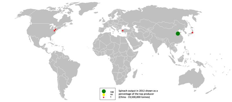 2012年世界菠菜主要出产国。图片:wiki commons