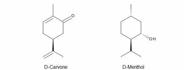 香芹酮(左)和薄荷醇(右)拥有相同的碳骨架,口味却相差很多。图片:helmuth-focken-biotechnik.de