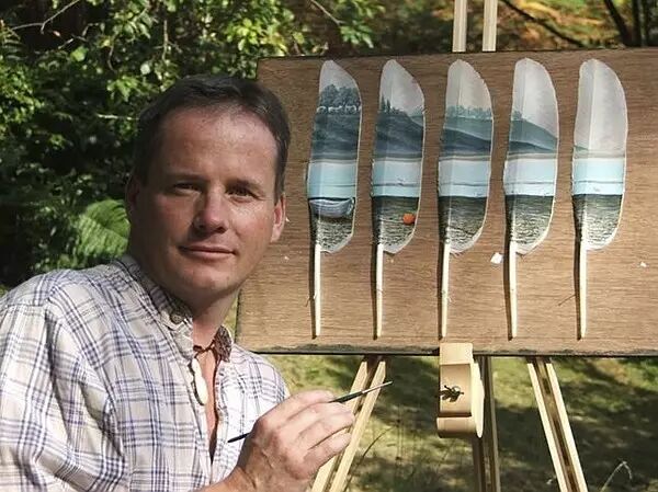 这些美丽的作品出自一位热爱野生动物的艺术家,伊安 · 戴维(Ian Davie,下图)。当画布拓展到五片羽毛,伊安能展示的就不仅仅是一个个窄小的片段,而是一幅相对完整的画卷。