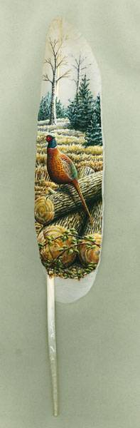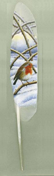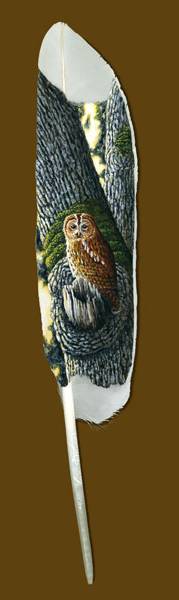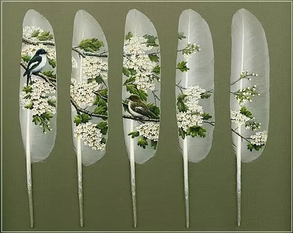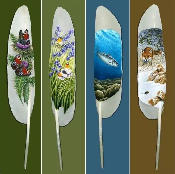 伊安有在探寻野生动物的路途中碰巧捡到的一些天鹅换羽时掉落的羽毛,而天鹅在鸟类中是相当大的,自然也就拥有相对其他鸟儿来说较大的飞羽——实际上,天鹅的飞羽是英国能找到的最大的一些羽毛之一——在这些较大的羽毛上创作那些细微的画作,显然能展现出更多的细节。