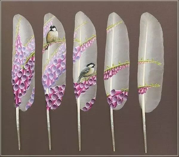 天鹅在欧洲文化里是高贵优雅的,并且常常和女王联系起来,这也让伊安更倾向于选择这类独特的、让人们喜闻乐见的鸟儿的羽毛作为他施展艺术天分的展台。在画完之前捡的一些羽毛之后,伊安便开始向一个鸟类保护区捐助,同时换取每年他们收集到的天鹅换下的羽毛。