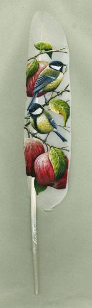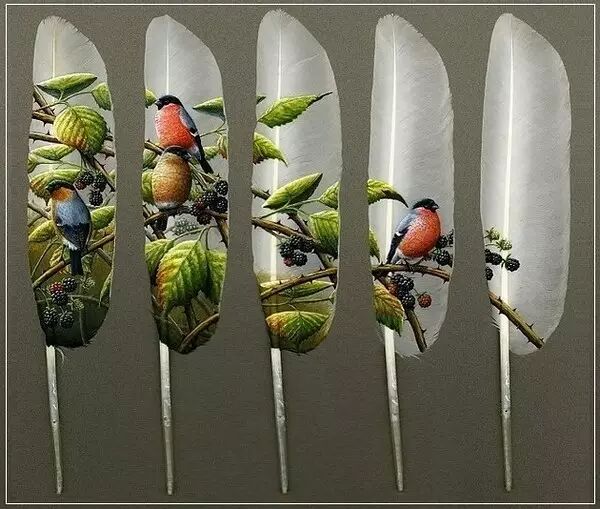 伊安的作品,大多以鸟类为主题,可见得他对鸟儿的偏爱。在鸟儿的羽毛上绘画栩栩如生的鸟儿,也是一种很别致的创作方式,每一根羽毛都承载着一只羽精灵,仿佛它们都是有生命的,这生命再融入本来就属于它们的一部分中。取之于鸟,再画之以鸟。