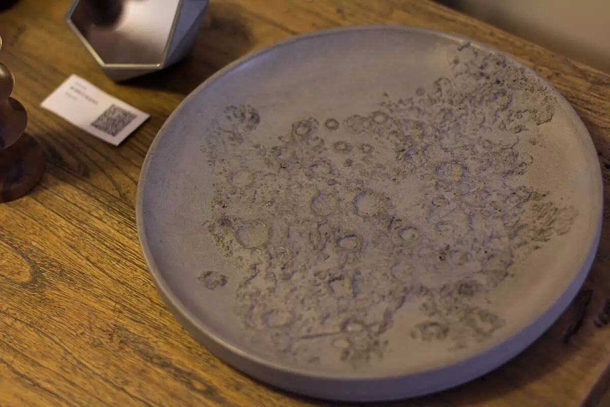砧板旁边是一个看上去有点古怪的盘子,盘子的表面是类似月球表面的环!形!山!