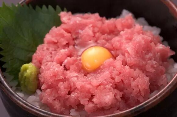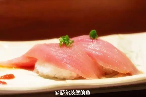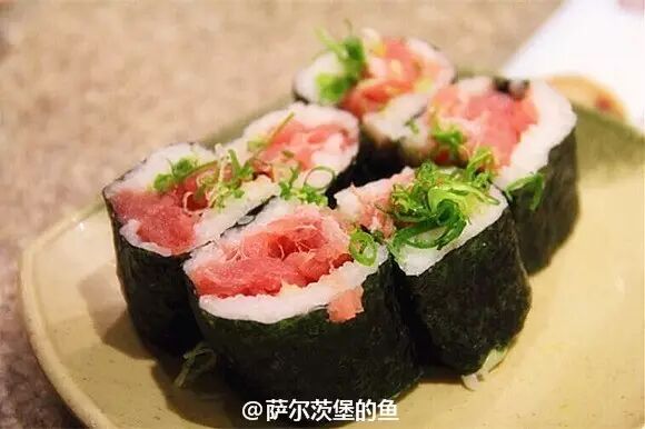 中落(nakaoti)金枪鱼脊椎骨周边的鱼肉,传统有逼格的手法是用贝壳细细刮下来,和葱花拌在一起可以做成葱腩negi-toro,有葱和鱼脂的混合香味,常常做成细卷和军舰卷,性价比很高。