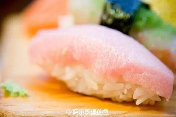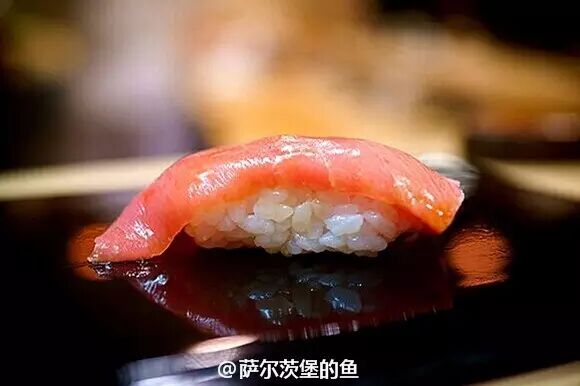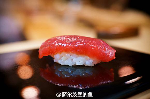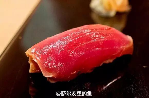 赤身(Akami)金枪鱼最普通也是肉量最多的部位,通常用酱油略微腌制后捏成寿司,脂肪含量低,口感软糯,具有清爽香味与淡淡酸味。