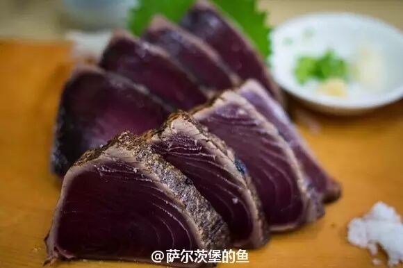 鲣のタタキ,将鲣鱼肉烤至表皮焦黄,但不完全烤透,然后佐以葱、蒜、大酱,淋上“Ponzu”(一种由柑橘汁、酱油、味淋混合而成的一种调制醋)一起食用。鱼肉中的肌红素氧化和蛋白质加热变性作用使得鱼肉呈现通透梦幻的紫红色。