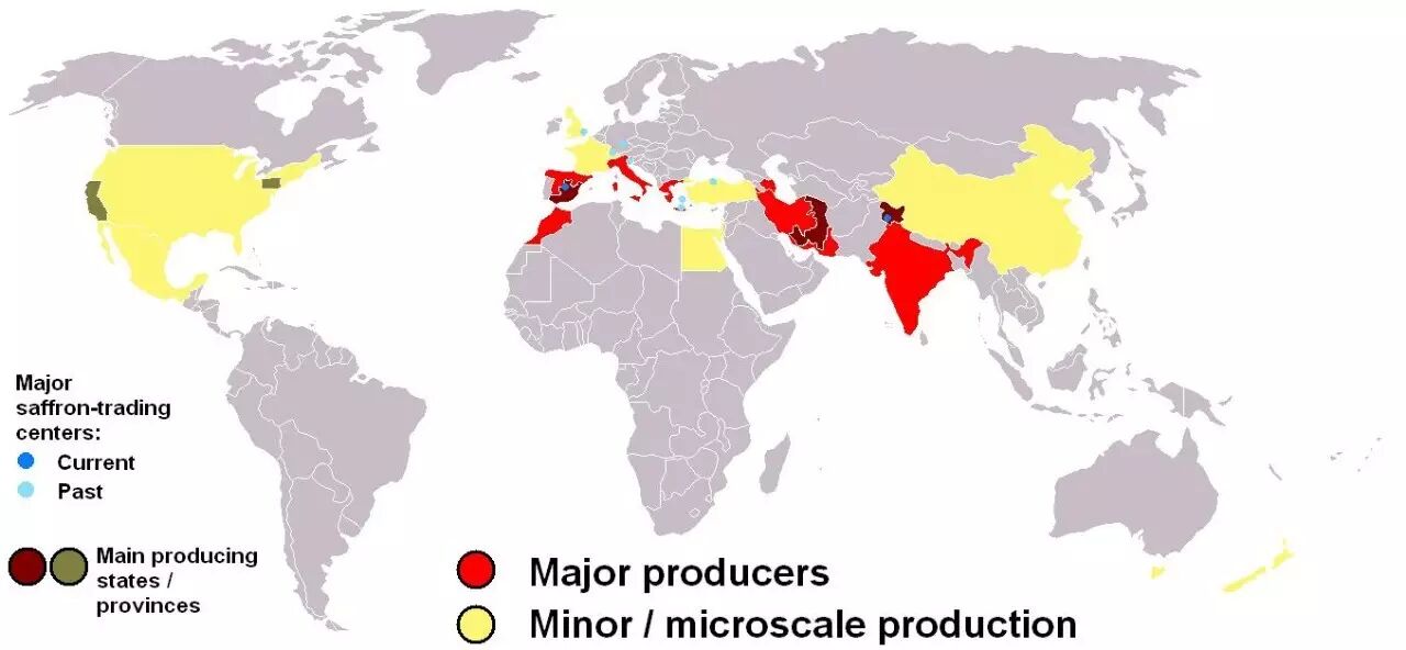 今天,藏红花的主要产区从西班牙一路向东延伸到印度,它尤其适合在冬季多雨、夏季干热的地中海气候带里生长。伊朗的番红花产量甚至可以达到世界总产量的90%。