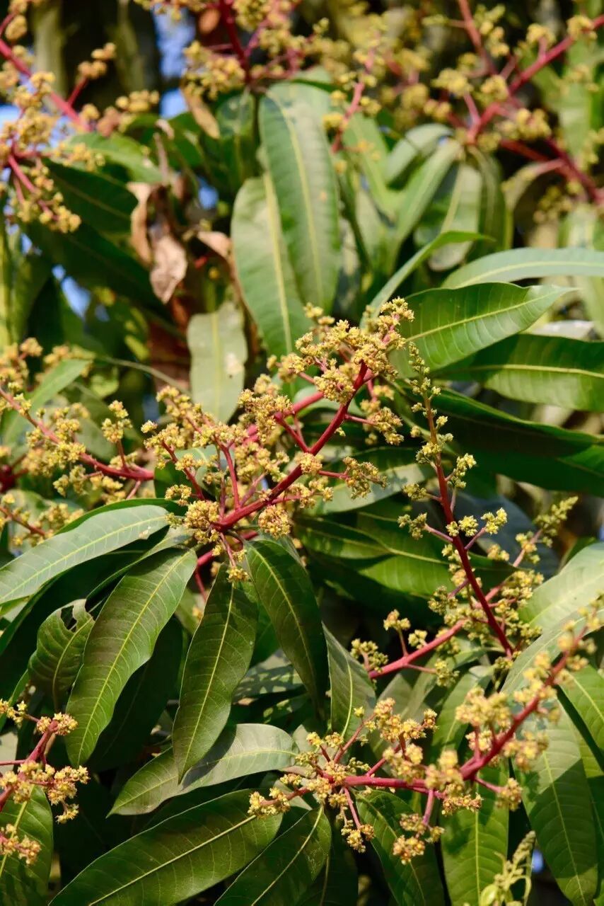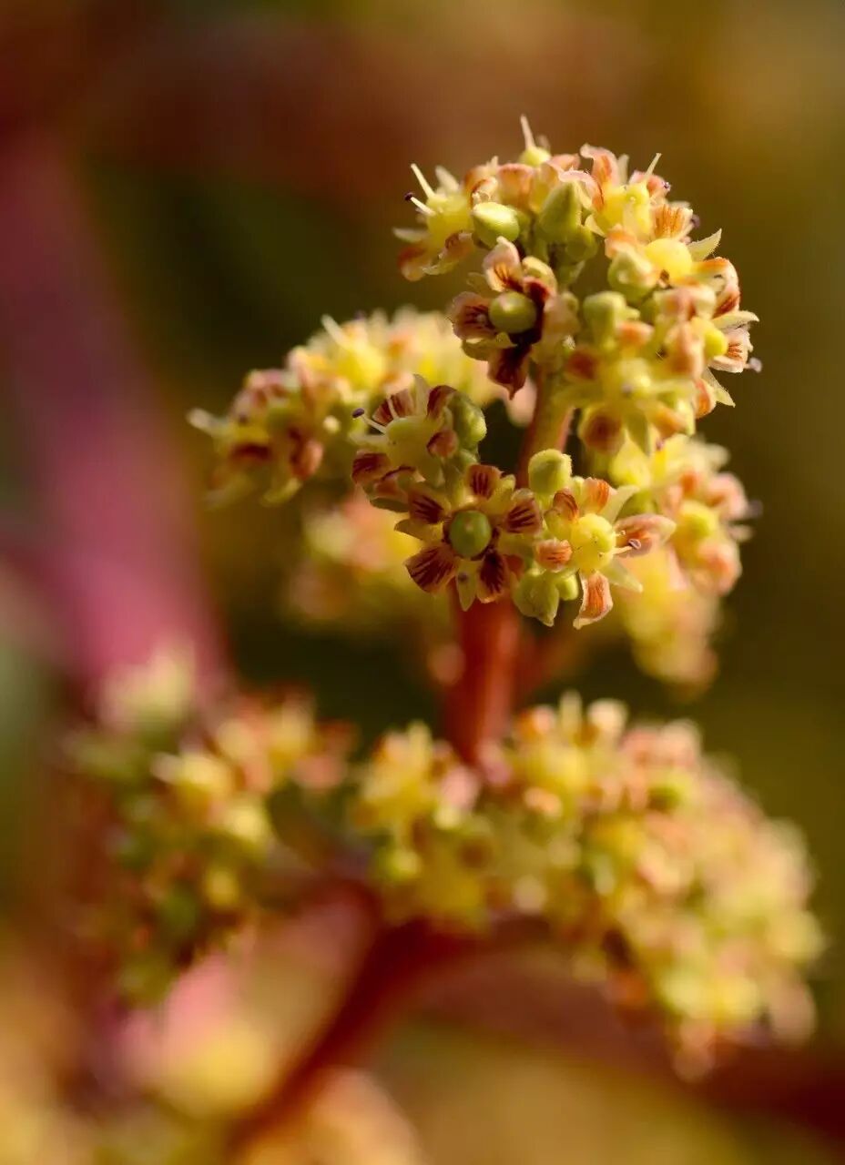 相对于芒果的果子,芒果花真的不起眼,以至于芒果开花的时候很少有人会注意到那些栗黄色或者淡黄色的小花朵,反倒是串起这些花朵的红色花序轴更为醒目。但不管怎么说,这些圆锥形的花朵集合(花序)很容易就淹没在芒果树密集的绿叶之中,很多时候都是悄悄地来,又悄悄地走。直到有一天,下垂的枝条上挂上了小芒果,我们才会发现芒果花已经开过了。