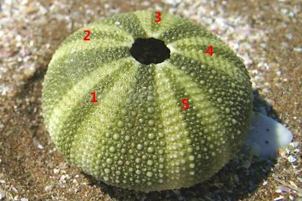 这其实就是五条由间步带区相连的步带系统,海胆都是一个以球形中心向四周呈现五辐对称的结构。再看看我们熟悉的海星的模样,五条相互分离的腕足(步带区)清晰可见,所以海胆某种意义上可以看做一只反着抱成团的海星,感叹大自然的神奇吧。