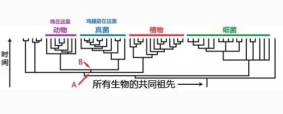 今天的小剧场比较隐晦,我先解释一下。生物演化论认为地球上所有的生物都是由一个共同祖先不断分化而来,这个过程抽象化之后就是一棵不断分枝的演化树。而衡量两个物种之间亲缘关系的远近,则是通过它们俩“最近的共同祖先”出现时间的早晚;体现在演化树上,就是二者共有的那个分叉点所处的年代。在下面这张图里,鸡所在的动物分枝和鸡腿菇所在的真菌分枝在B点分开,栗子所在的植物分枝在更早的A点就分出去了。所以我们说,相对于鸡来说,所有植物都不如鸡腿菇离得近。