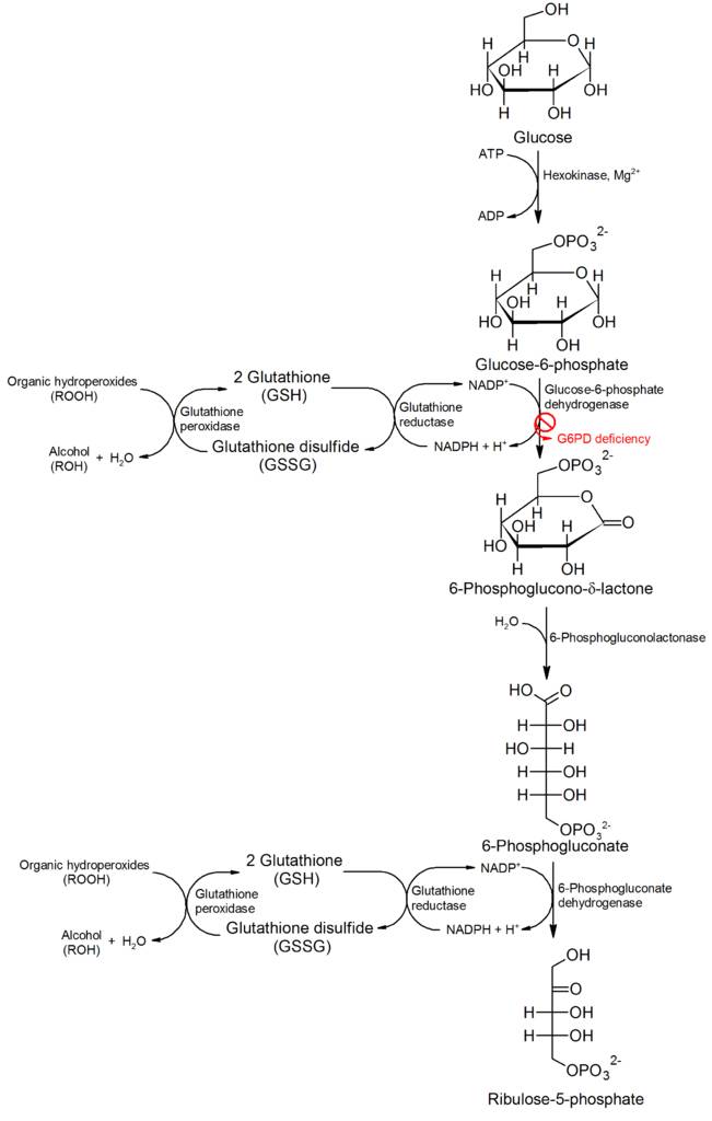 葡萄糖-6-磷酸脱氢酶在戊糖磷酸途径中发挥作用的位置。戊糖磷酸途径在人类的血红细胞中起到了非常重要的作用,一旦失效,血红细胞就会因为承受不了氧化胁迫而破裂。(当然,你其实完全不用看懂这张图片)图片:wiki commons