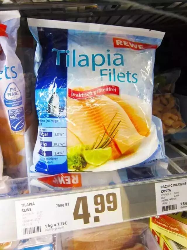 罗非鱼产肉率高,鱼肉白皙中微微泛着粉色(是啊,不然也不会被当做鲷鱼)算不上鲜美无比但也尚可,因为深受不会挑刺儿的广大西方国家消费者的欢迎,于是罗非鱼被加工成各种鱼柳、鱼排或鱼片,欧洲的超市里也随处可以看到罗非鱼的身影。或煎或炸或烤,简单的撒一些香料,就是一道不错的晚餐主菜。