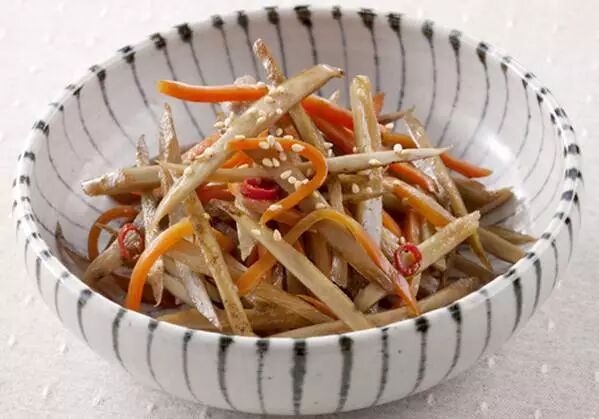 金平牛蒡(キンピラ ごぼう)也是一道传统菜,相传金平是赖光四天王之一的坂田金时之子,性格强硬暴躁,力大无穷,后世商人就以金平作为牛蒡的卖点了。金平牛蒡类似酸辣土豆丝,只不过不是用醋而是用酱油调味,牛蒡要纵切成丝,加上胡萝卜丝、酱油、糖、日本米酒,文火炖煮。