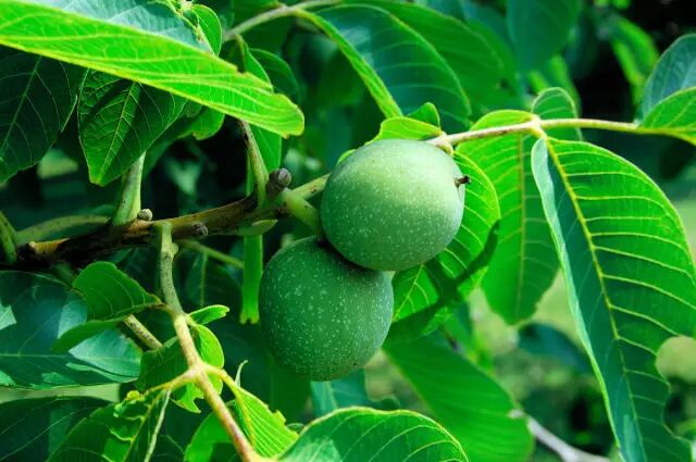 我们平时吃的核桃,在中国植物志上的典范中文名,其实是胡桃(Juglans regia)——没错,就是童话故事《胡桃夹子》里用那个小人来咬开的胡桃。之所以要用到胡桃夹子,想必大家都清楚——胡桃有一层坚硬且坑坑洼洼的外壳,要费好大劲打开这层“外壳”,才能吃到胡桃的仁。不过,这黄褐色的坚果并非胡桃在树上本来的样子。如果在胡桃成熟的季节去看,会发现挂在枝头的是一个个青色、椭圆形的“果子”,这才是胡桃果实的“完全体”。当胡桃在采摘后,要经过浸泡、揉搓、剥离,将那层黄绿色、肉质的外果皮去掉,显露出的才是那层黄色、骨质的内果皮,也就是我们在市场上看到的样子。