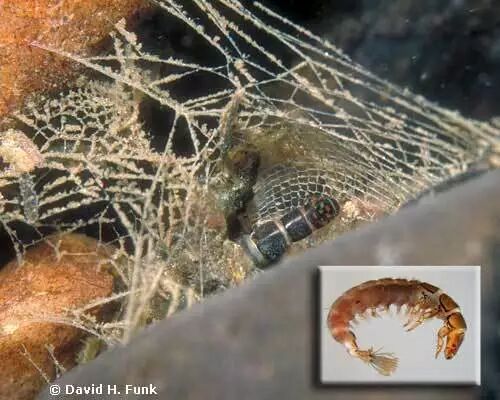 石蛾的水生幼虫(石蚕)有很多不同的生活方式,最著名的是用丝和树枝石头之类筑成随身携带的筒巢的那类,也有一些自由生活,但还有一类是织网的。