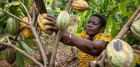 在科特迪瓦,手持长刀的妇人正在从树上采收可可果实。图片:nestle.com