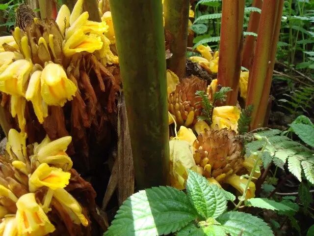 尽管出身低矮,草果的花却相当华丽。姜科植物的花结构特殊,花被片往往并不发达,却有一枚雄蕊特化成大型的唇瓣,有鲜艳的颜色和深色的花纹,告诉传粉昆虫“这里有蜜吃”。草果的唇瓣是黄色的,上面有两条橙红色的蜜导,这是蜂类喜欢的颜色。