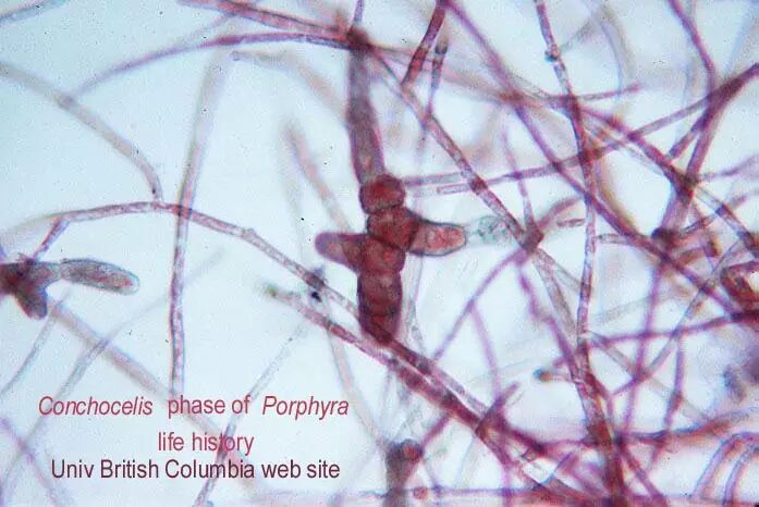 每年冬天,气温低于15℃的时候,紫菜的繁殖开始了。在它们叶片状的身体上,会产生精子和卵子。前者急匆匆地跑去跟后者约会,就产生了爱情的结晶——果孢子(类似种子的细胞)。你要是认为这些孢子会直接长成大紫菜,那你就错了!这种果孢子泡在海水里是永远不会长成紫菜的。它们需要特殊的生活环境——贝壳,没错!就是牡蛎或者文蛤的壳。不过,我们为啥没见过紫菜长在贝壳上呢?很简单,紫菜寻找的不是立足点,而是温暖的居室。萌发产生的那些丝线一样的紫菜会钻进贝壳,当然了,我们的植物学前辈完全不知道这个过程,于是丝状体被认为是另外一种藻类植物,同时还有了一个名字——壳斑藻。