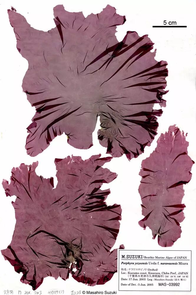 在贝壳里好吃好喝的壳斑藻也没有闲着,它们会产生另一种孢子——壳孢子。从这个孢子长出来的,才是有紫菜模样的东西。不过,大多数情况下,这些紫菜的个头都会比较小,小到冲一碗紫菜汤需要几十片。更奇怪的是,它们要长大就必须要低温,当海水温度低于15℃的时候,小紫菜才会“神奇”地长成大紫菜!