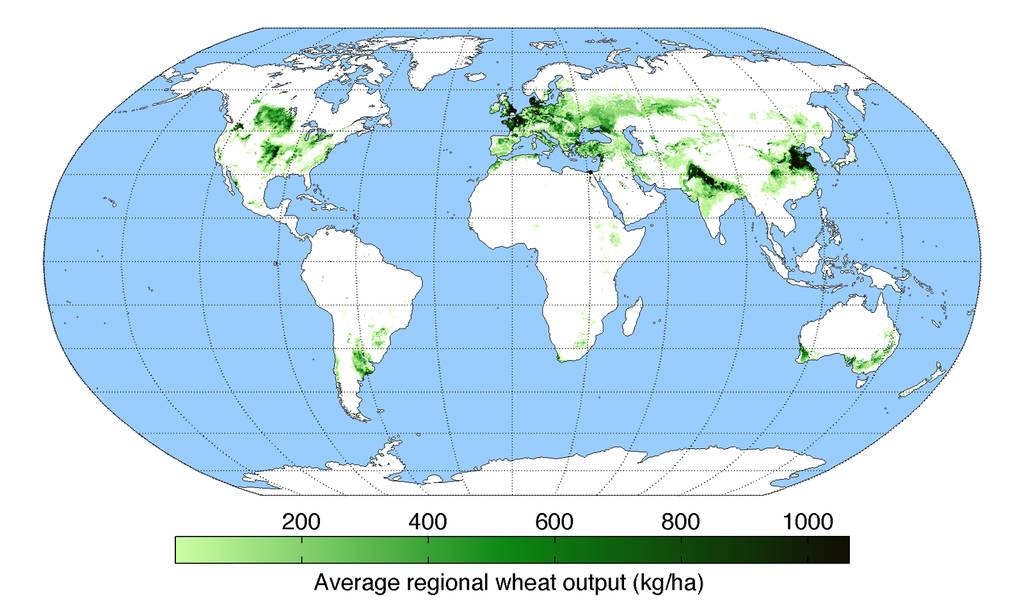 现在,小麦在世界各地的产量,绿色越深产量越高。图片:wiki commons