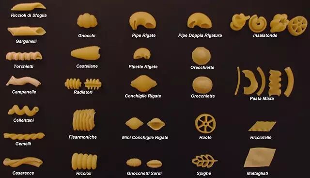 说到这儿就不得不提意面了。意面的精髓在于硬粒小麦(durum wheat),产于地中海干燥地区,面筋蛋白含量更高。在加入鸡蛋、并略微发酵后,能做成各种形状。工业时代到来之后,生产形状各异、易于保存的干面让意面的流行程度大增,不同的意面形状(管面、螺旋面、长面、宽面、贝壳、蝴蝶……),配合不同的酱汁(奶汁、茄汁、青酱、白酒等等),能产生丰富的食用效果,也能让你一个月30天不带重样。