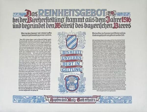 “根据我省当局指示,我们特此宣布如下法令,从今开始,在巴伐利亚公国的乡村、城市与市场里,以下规则适用于啤酒的销售:
