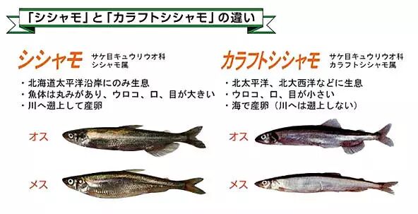 2. 毛鳞鱼(Mallotus villosus):又叫樺太柳葉魚、カラフトシシャモ,英文名Capelin。属胡瓜鱼科毛鳞鱼属,分布于北冰洋、大西洋、北太平洋,主要产自冰岛、挪威、加拿大等国。体长约20-25cm,雄鱼体型较雌鱼小。